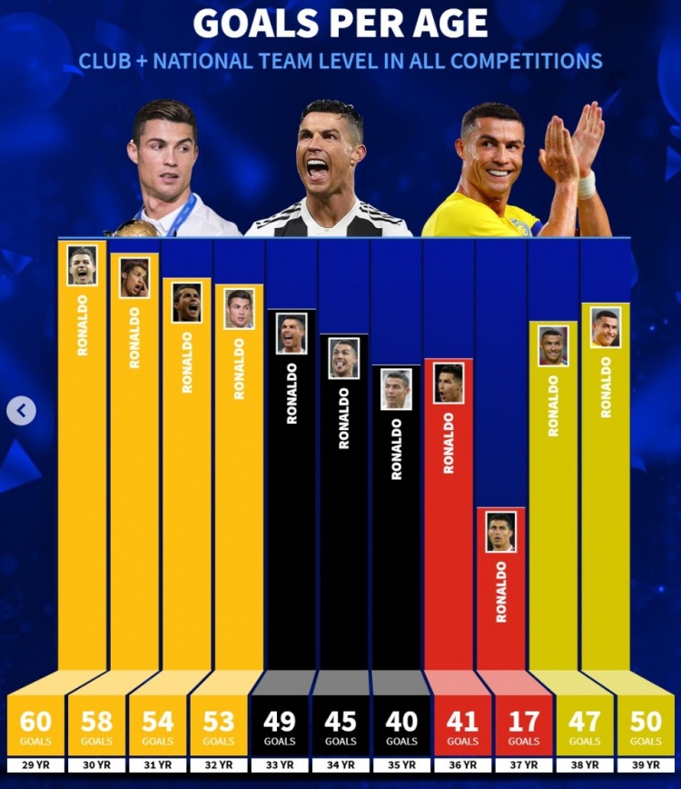 2月5日訊 C羅在今日迎來(lái)40歲生日,《轉(zhuǎn)會(huì)市場(chǎng)》也列出了C羅生涯每年的進(jìn)球情況。